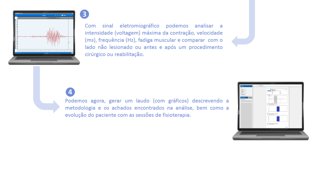 É por isso, que agora conto com uma tecnologia de eletromiografia de superfície (EMGs), um recurso seguro, não invasivo, indolor, que possibilita analisar a ativação dos músculos esqueléticos, através do registro dos potenciais elétricos produzidos durante as contrações musculares. Com isso, podemos registrar, a intensidade (μV), velocidade, frequência das contrações, bem como a presença de fadiga ao executar um movimento.